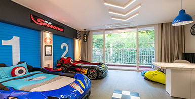 침실겸거실(자동차키즈침대),침실, 화장실(샤워부스)로 구성되어있으며 아이동반 취향저격 리조트객실